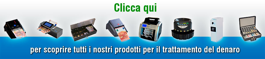 La nostra azienda opera nel settore dei prodotti per il trattamento ed il controllo del denaro e commercializza anche un'ampia gamma di registratori di cassa e misuratori fiscali, oltre a macchine contasoldi (contabanconote e contamonete), inserti per cassetti, cestelli, cassette di sicurezza, casseforti, accessori vari, ecc.